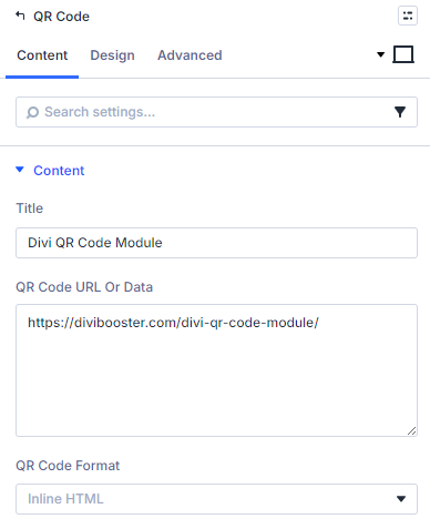 Open the module settings and enter the destination URL or data in QR Code URL or Data.