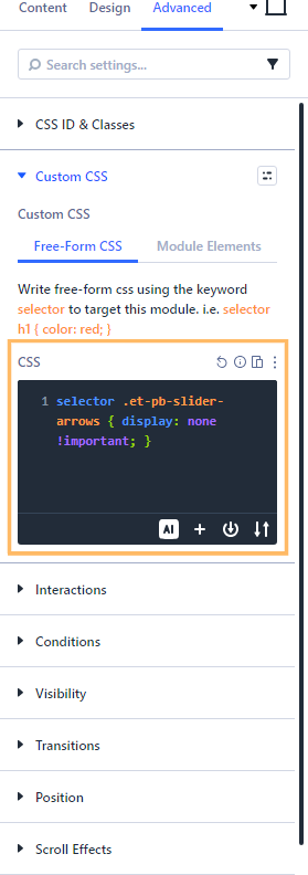 With the Gallery module settings still open, go to the Advanced tab and expand the 'Custom CSS' section. Enable the Free-Form CSS field and paste the following CSS rule to hide the slider navigation arrows:
