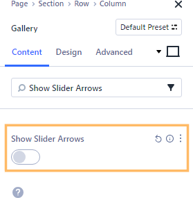 Open your Gallery Module settings and head to the Design tab. In the "Layout" section, select 'Slider' as the layout. Then, switch to the Content tab, open the 'Elements' section, and use the search box to find the “Show Slider Arrows” setting. Toggle this option to "No". This will hide the slider arrows completely, even when you hover over the images. Your gallery will now display images using the slider layout without any navigation arrows getting in the way.