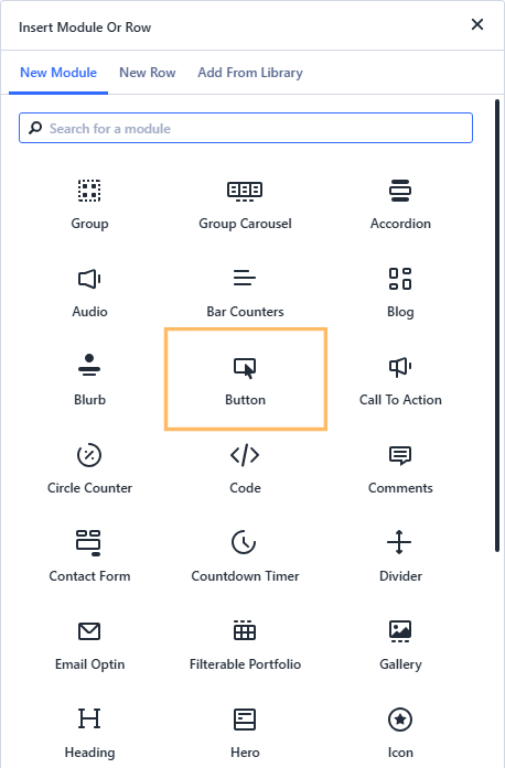 To get started, open your page in the Divi Builder. Add a single-column row to your layout if you don’t already have one. In that row, insert a Button module from the module library. When prompted for the button text, enter a label such as "Fullwidth Button"—this will appear on your button.