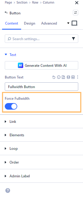 With the Button module settings open, head to the Content tab. Find the option labeled "Force Fullwidth" and toggle it on. This setting makes your button stretch to fill the entire width of its container and ensures the button text remains centered.