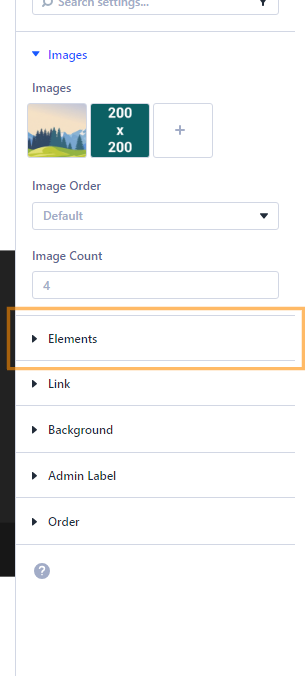 With your gallery images already added, open the Gallery module settings. In the module panel, find the section labeled 'Elements' and click on it to expand the available options.