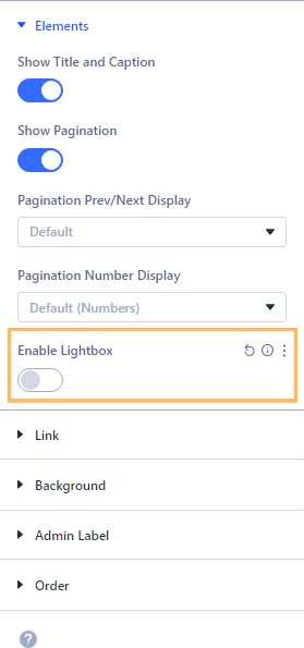 Locate the 'Enable Lightbox' setting in the Elements section. Click the toggle to set it to Off (No). This will prevent the lightbox popup from showing when gallery images are clicked.