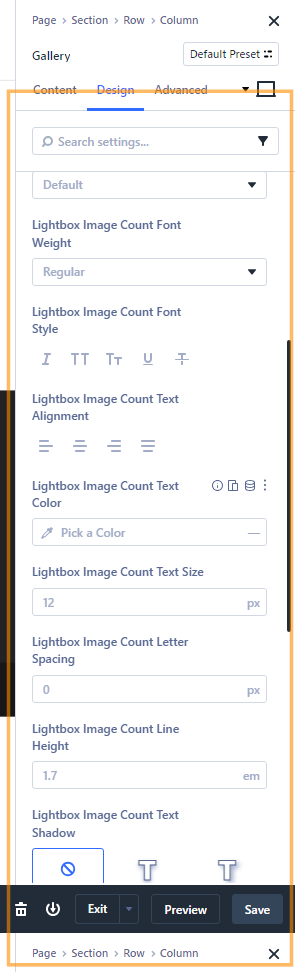 Scroll down in the Design tab until you find the 'Lightbox Image Count' group. Click on it to expand and reveal the settings for customizing your image counter. These options are available thanks to Divi Gallery Booster and Divi Booster plugins.