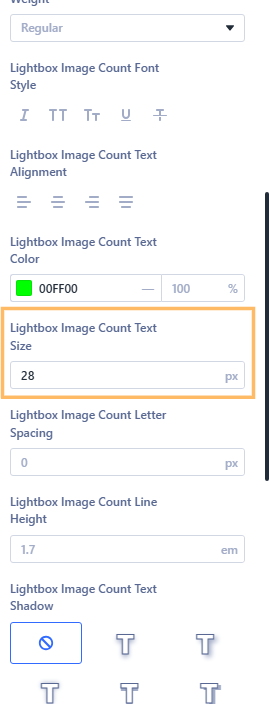 Still in the 'Lightbox Image Count' section, find the Text Size setting. Enter your chosen size, such as 28, to make the counter larger and more legible.